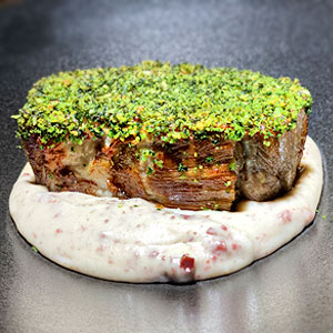 最もきめが細かく柔らかい赤身の部位であるランプを使用した石垣牛の串焼き。